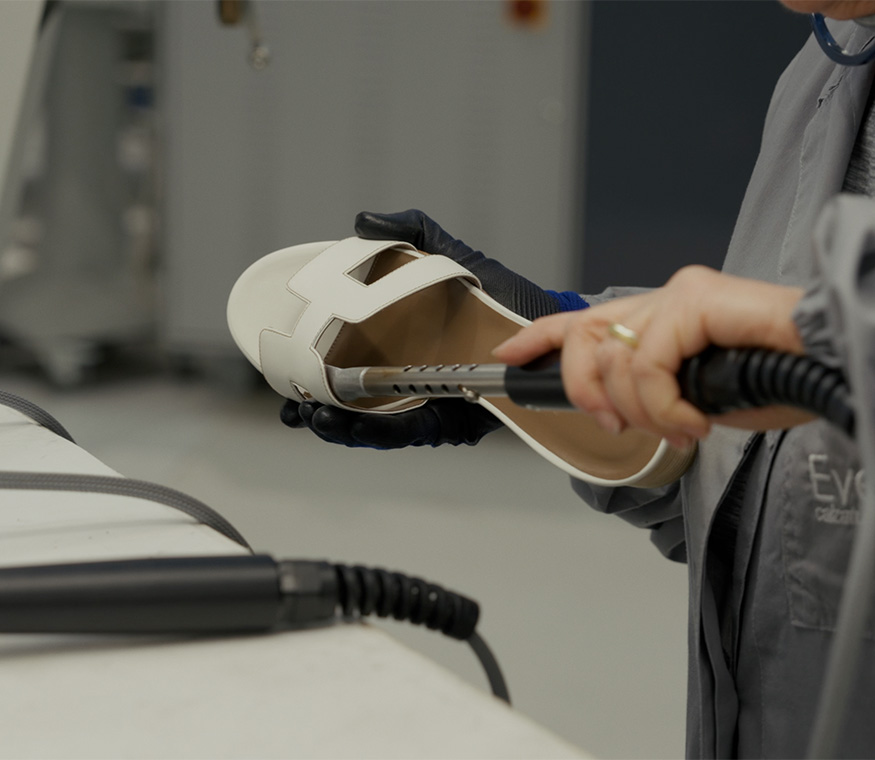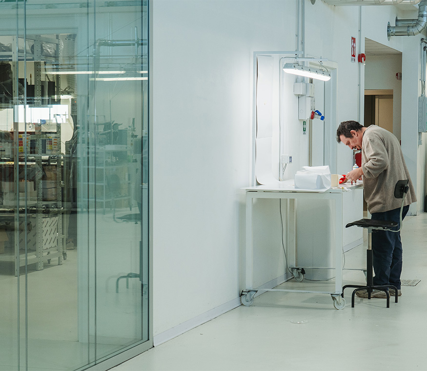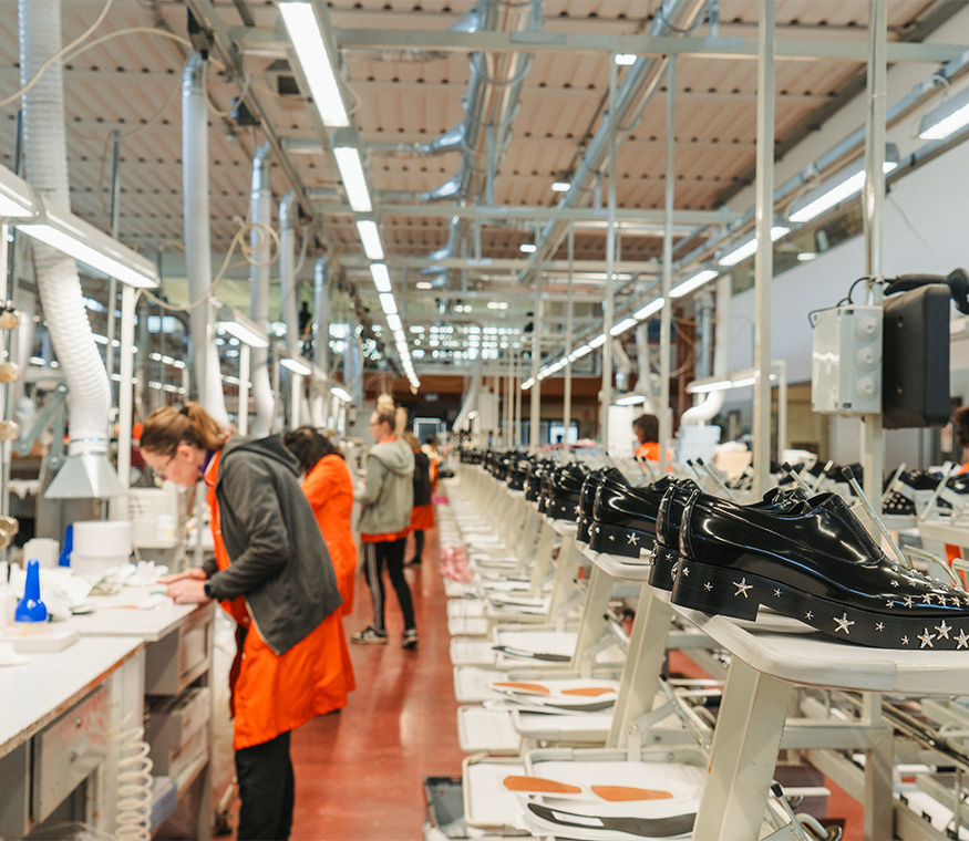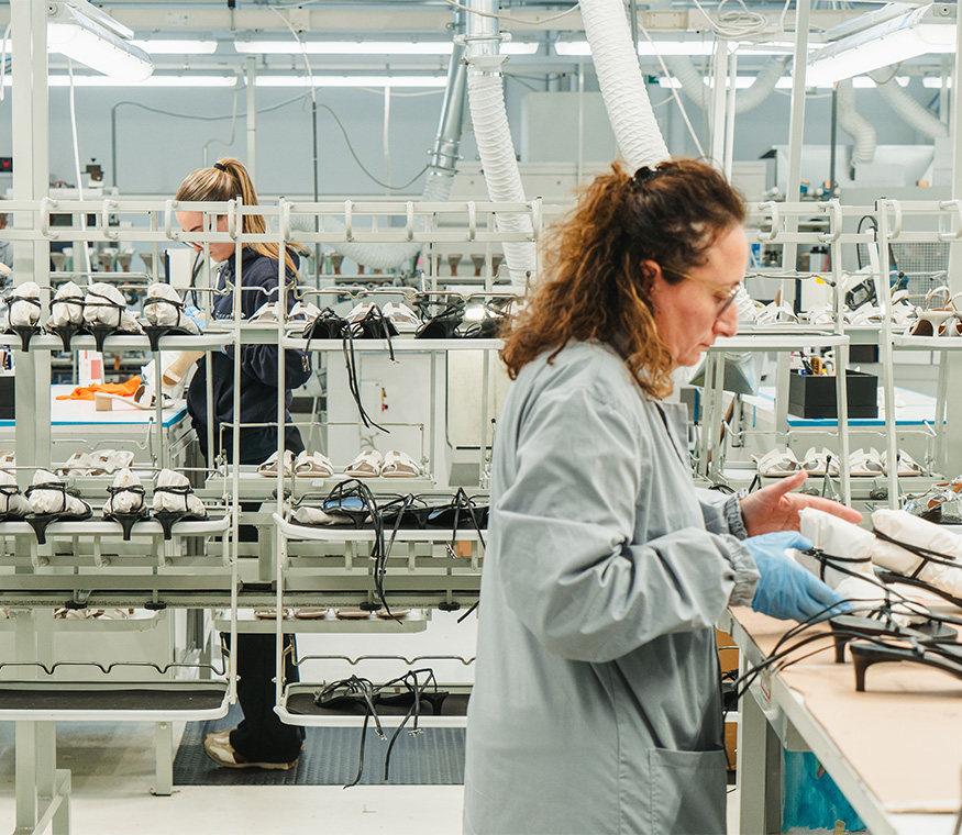 Suole e fondi vengono applicati secondo le specifiche del modello, completando la struttura della calzatura. Ogni paio è quindi rifinito manualmente e sottoposto a controlli qualitativi finali. Confezionamento, monitoraggio dei flussi produttivi e sistemi di tracciabilità accompagnano il prodotto fino alla consegna, assicurando trasparenza, affidabilità e standard qualitativi elevati lungo tutta la filiera.